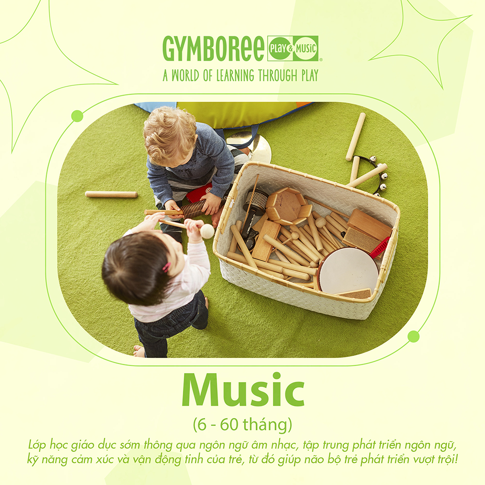 Lớp Music tại Gymboree là lớp học giáo dục sớm thông qua ngôn ngữ “âm nhạc”, tập trung phát triển ngôn ngữ, kỹ năng cảm xúc và vận động tinh của trẻ, từ đó giúp não bộ trẻ phát triển vượt trội!
